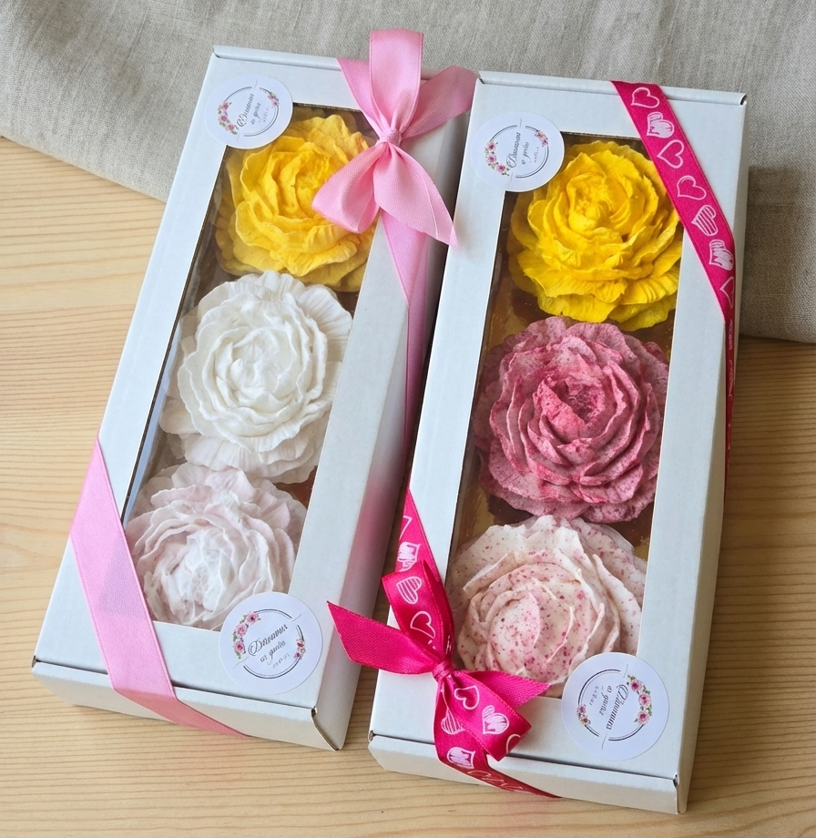 Trīs ar rokām veidoti zefīra ziedi vienā dāvanu kastītē.